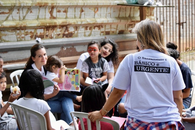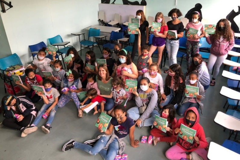 Contamos a história, entregamos livros e distribuímos absorventes para que levem para as mães.